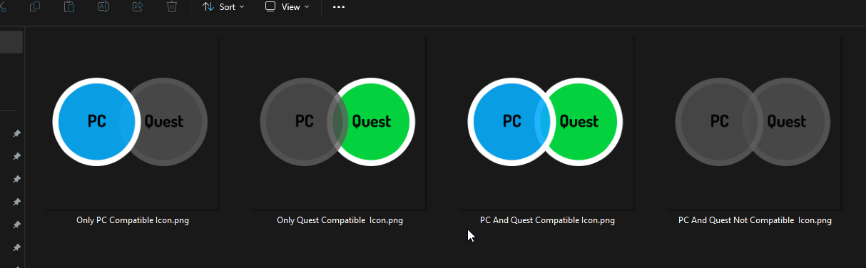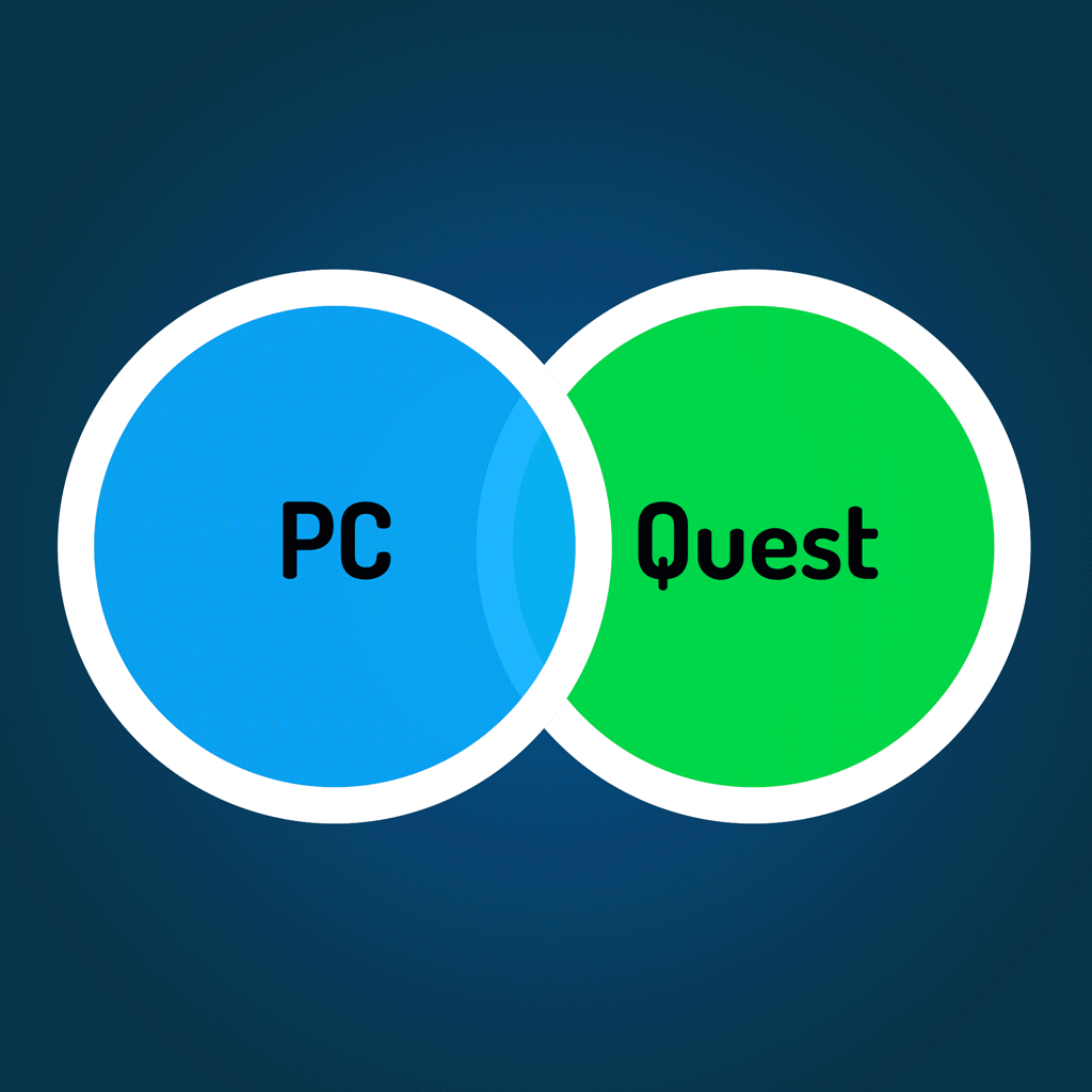 I don't know if anyone needs this particular pngs for pc and quest icons but I made some anyway. There is three pngs in the folder that you will receive after downloading and they are pc and quest compatible, quest and not pc compatible, pc and not quest compatible.